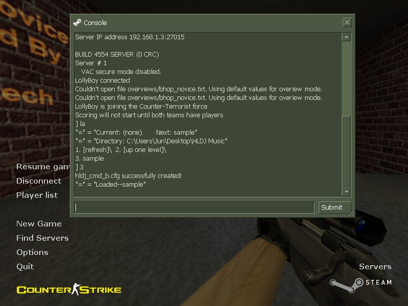 Whenever I try to play a song through hldj in Counter-Strike 1.6 it will not play. I have a fully functional microphone on my laptop (I doubt that matters though) and Windows Vista SP2.
